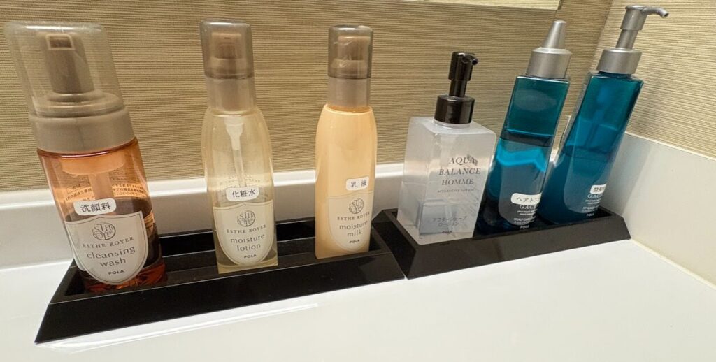 歯ブラシなどの他に、男性・女性用のスキンケアも各部屋に常設されていました。